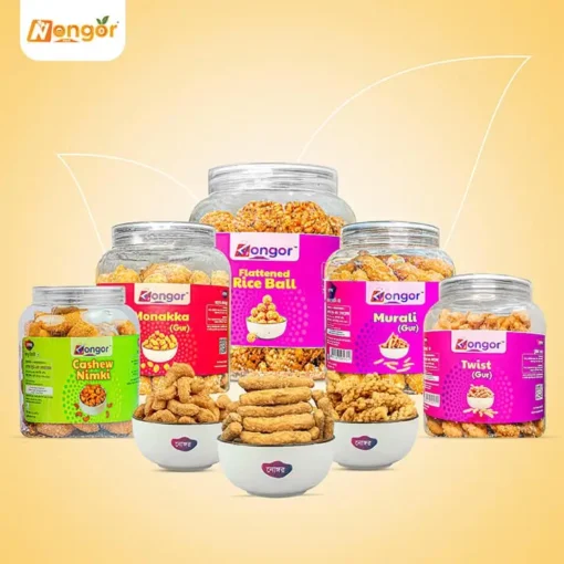 Cashew Nimki, Twist, চিরার মোয়া, মোনাক্কা আর মুরালি—সব একসাথে।